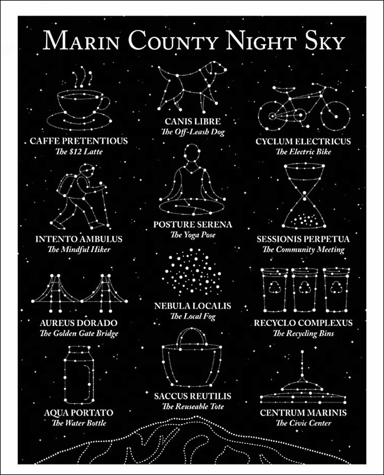 Welcome to the Marin County Night Sky … where stars reflect what matters most — fog layers, mindfulness, and occasional existential clarity.